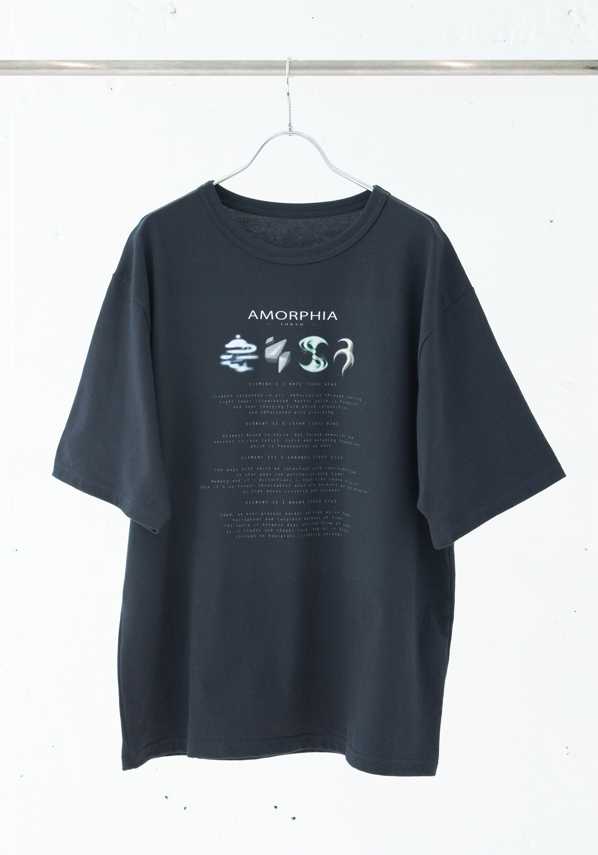 AMORPHIA TOKYO 23SS リリースパーティーを記念して、 これまでに発表した4つのエレメントが集結したTシャツとなっております。 4つのエレメントと、エレメントに関しての説明が書き記された特別なアイテムです。 ベースの生地には、肌触りの良い天竺を使用し、普通のブラックよりも薄いグレーを 帯びているのが特徴の墨黒を採用しております。 コットン100%