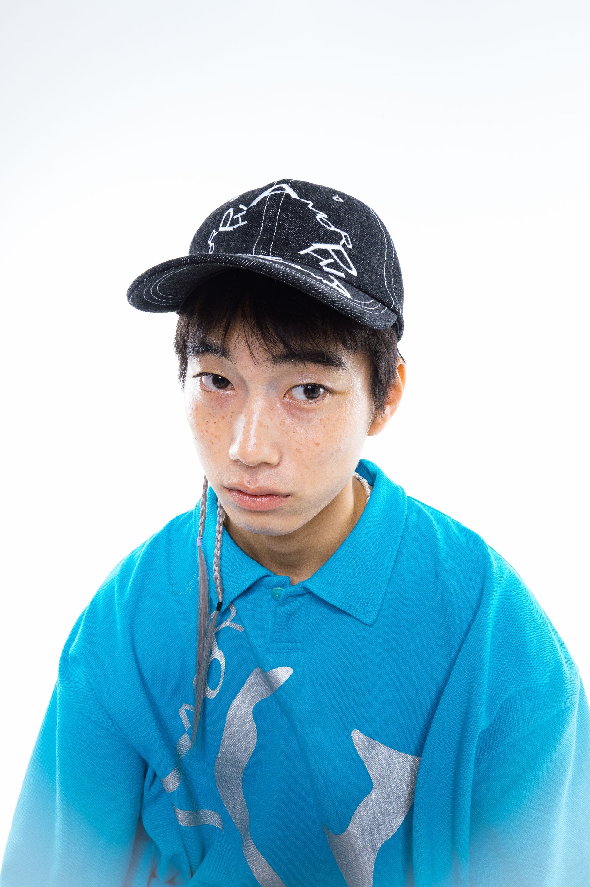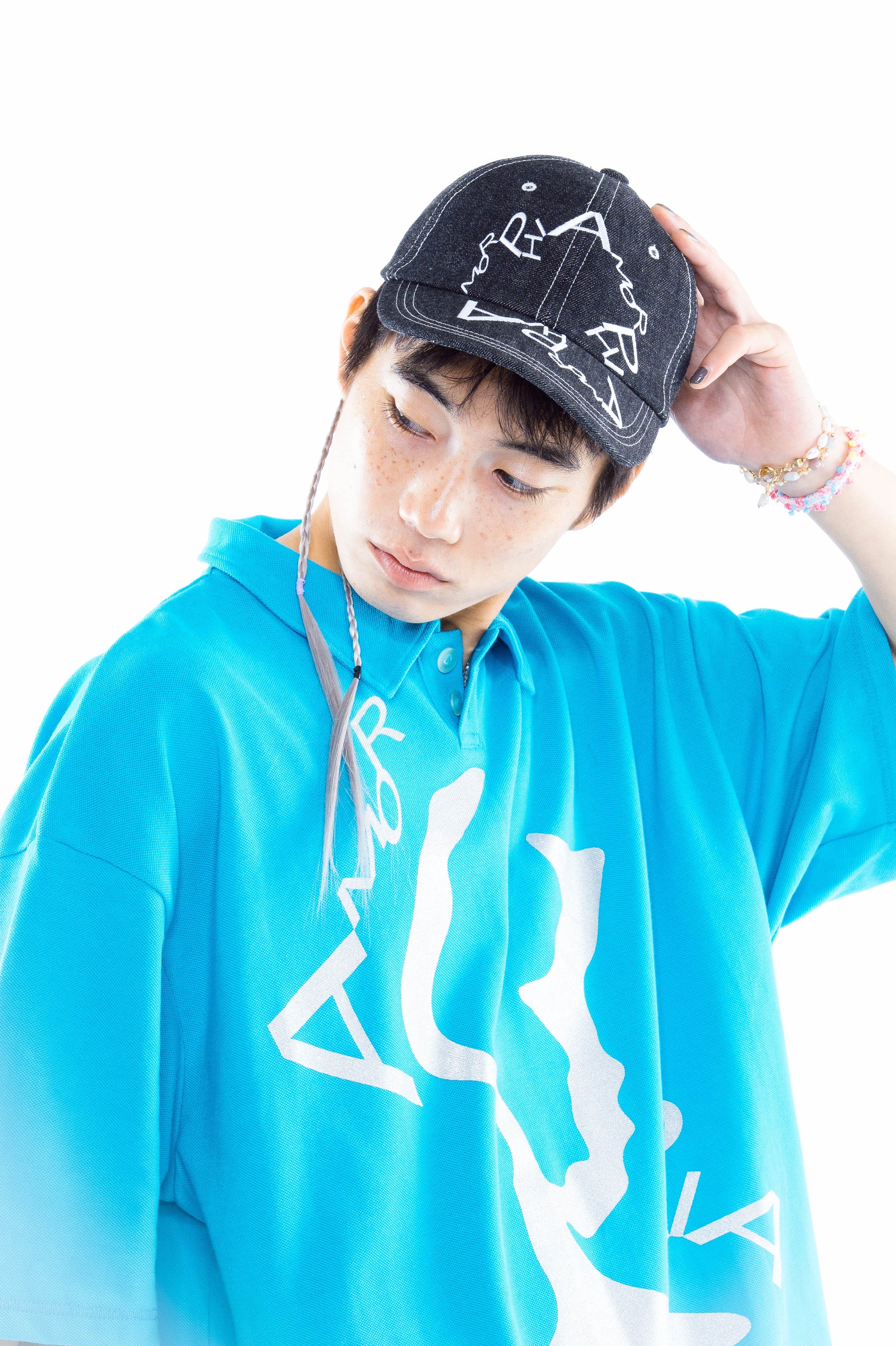 Utilizes a soft-textured denim fabric that has been subjected to a one-wash process. The design, which arranges the letters of "AMORPHIA" in a circular pattern, is striking. The contrasting embroidery serves as an accent. A snap adjuster is used on the back, allowing for smooth size adjustment.