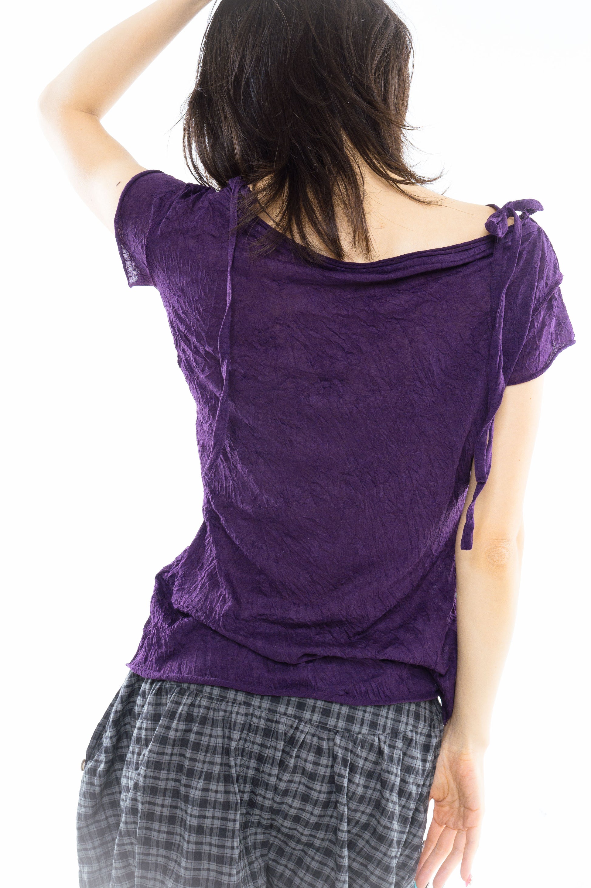 Utilizes a fabric with a texture resembling natural wrinkles, along with a natural feel and soft drape. The ribbons tied at the shoulders create a mood that suggests a certain innocence or youthfulness. The raw-cut finished details create a casual, worn-in texture.