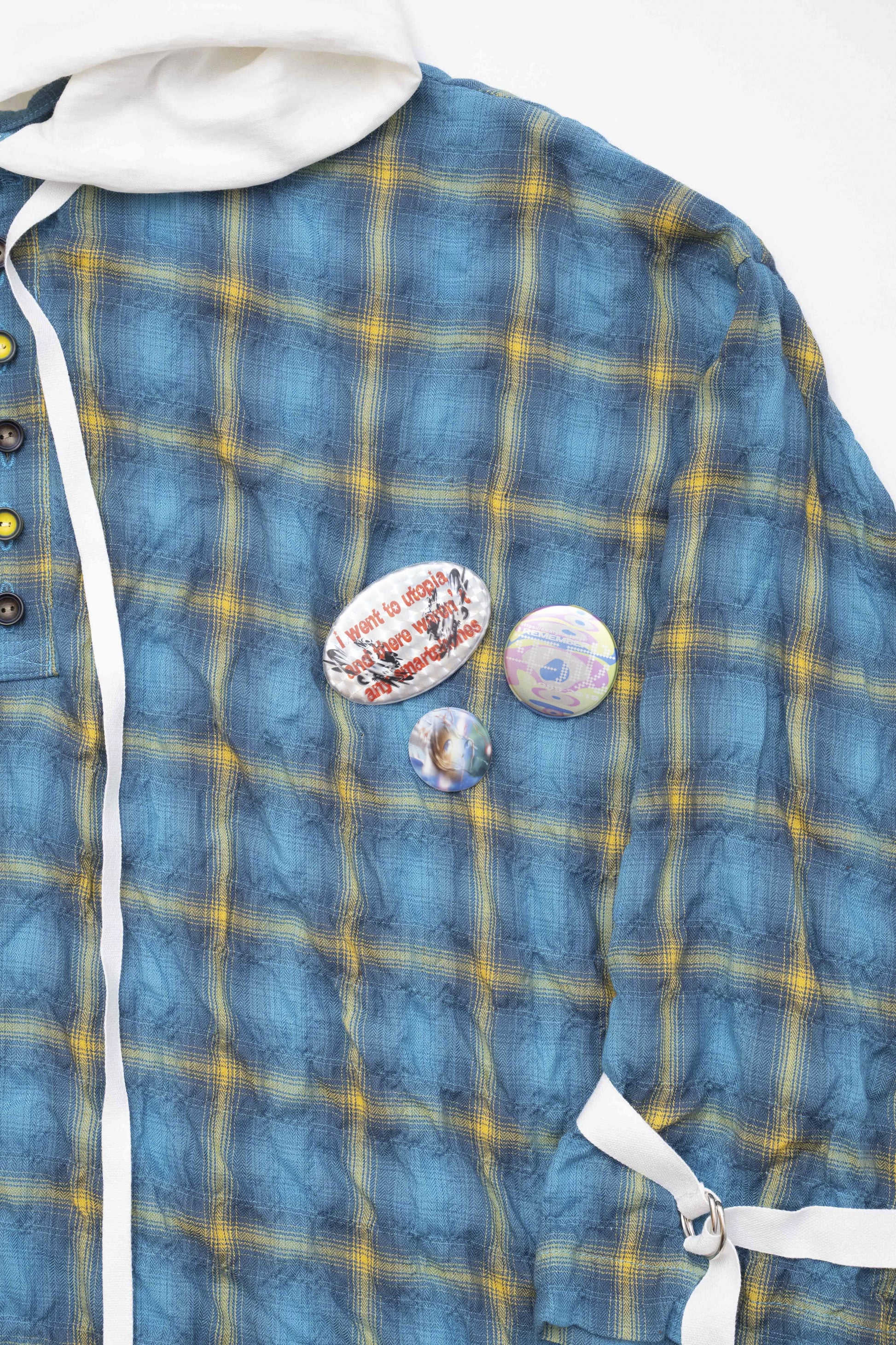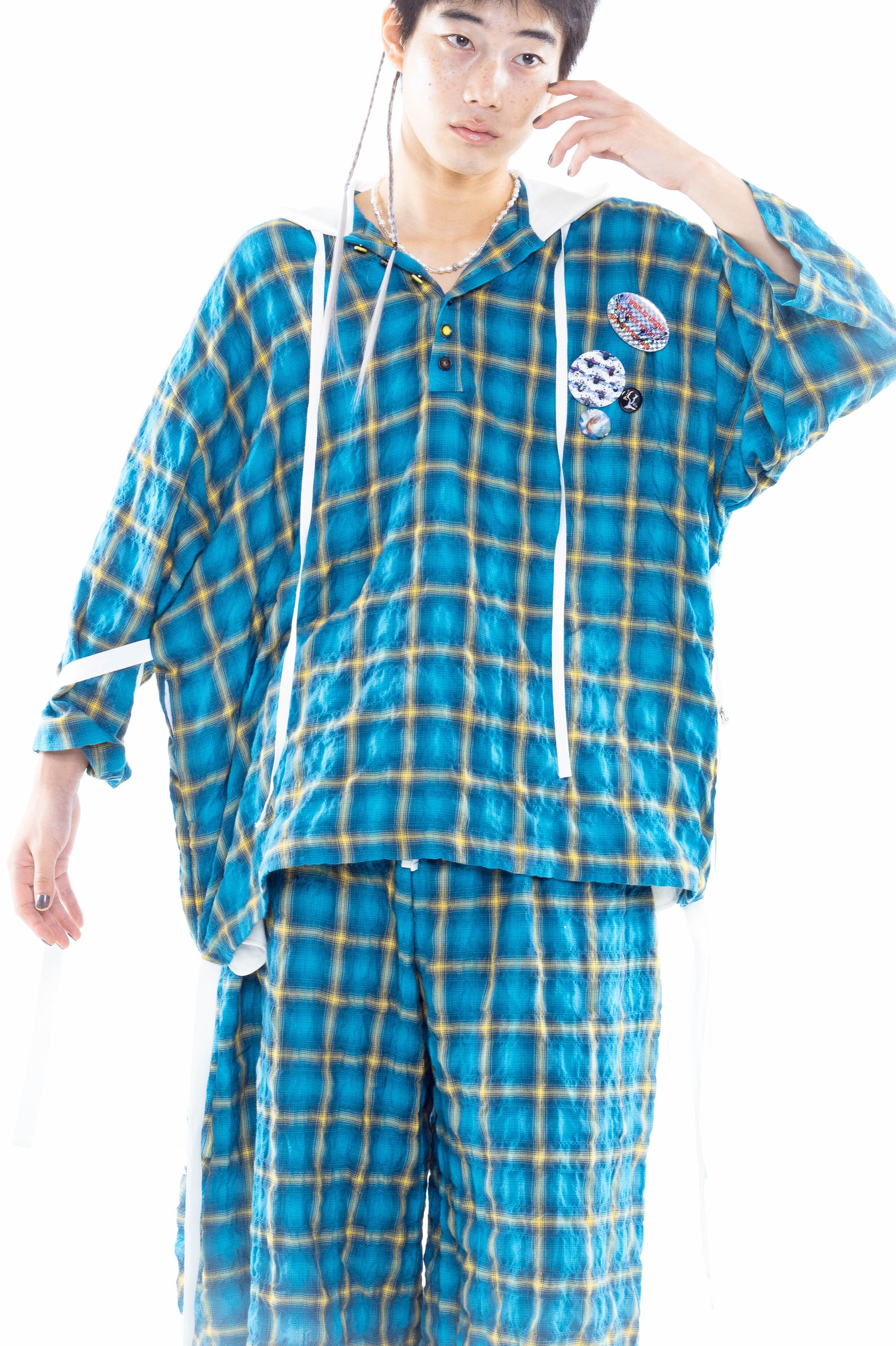 The hood is made with a flowing, smooth material, adding a sense of boyish innocence, while the front placket features two-tone buttons, expressing a subtle playfulness. Ribbons are placed on the sleeves and hem, serving as accents that broaden styling options. Comes with 3 original, removable pin badges. This item can also be enjoyed when paired with the matching Epoch Cropped Pants.