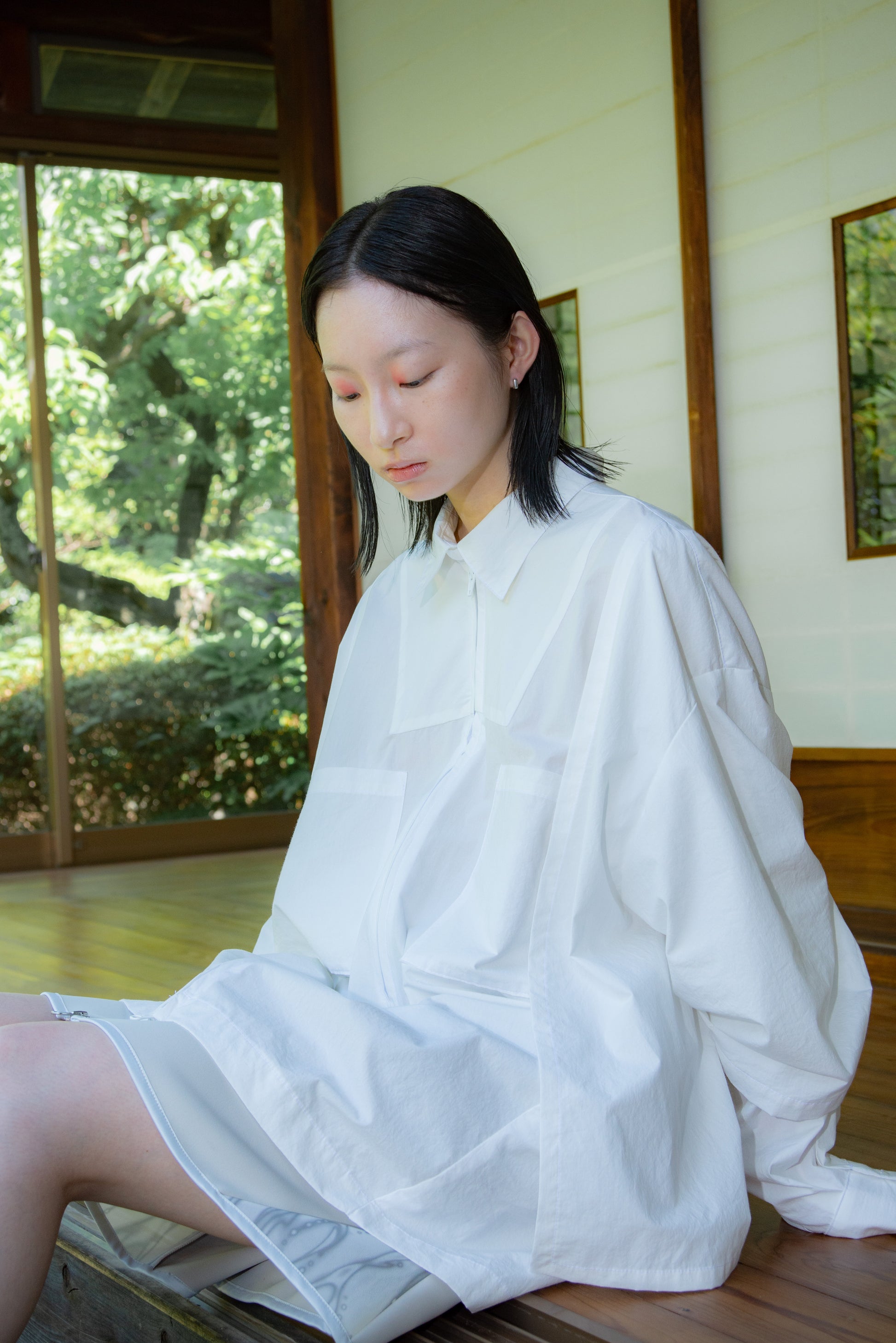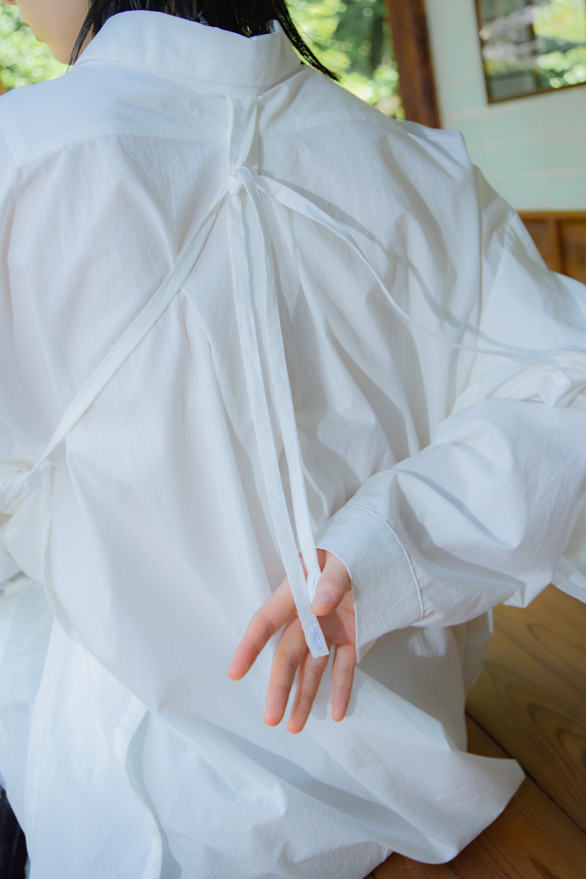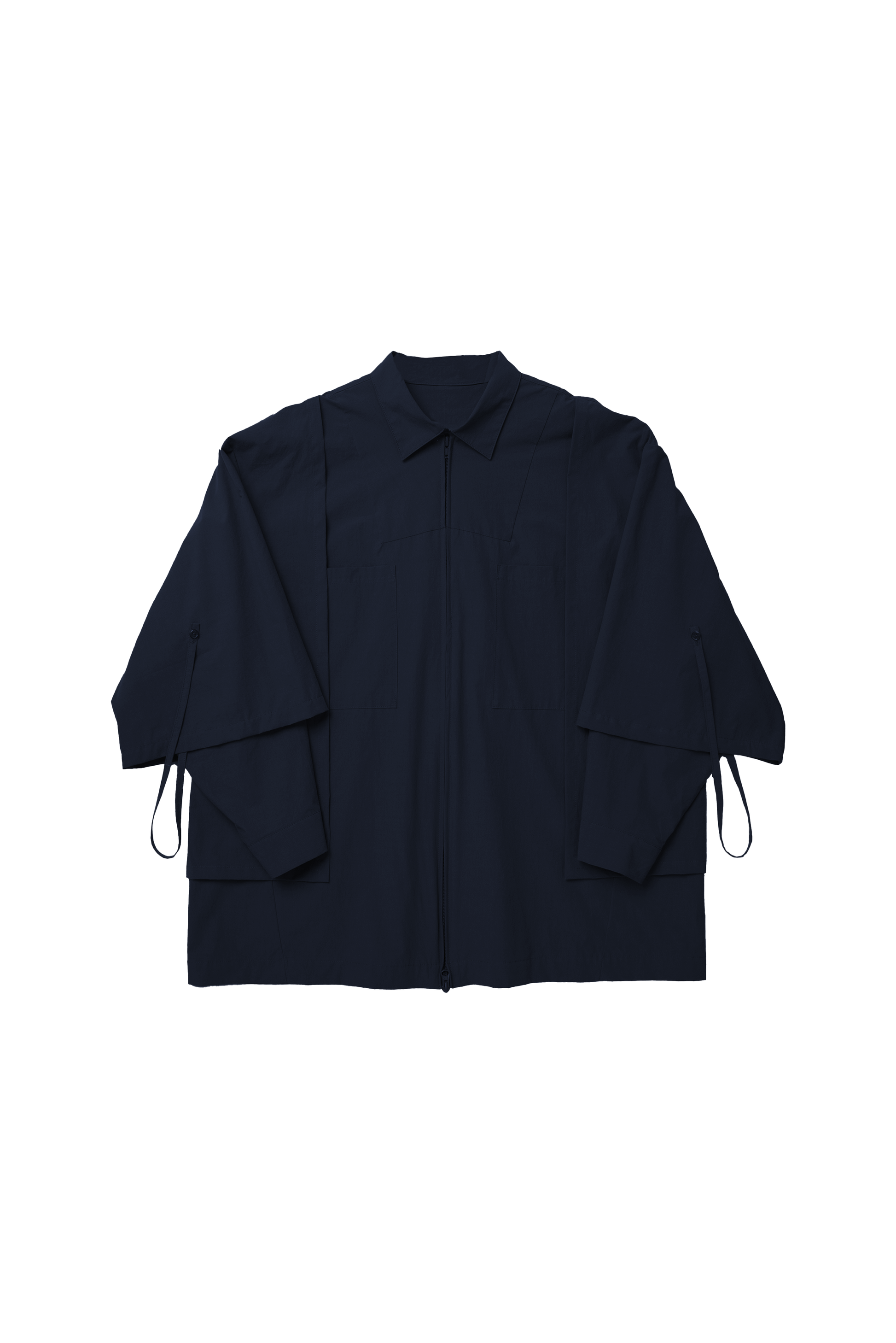 Dress shirt-like blouson which uses materials that have a vintage texture and natural grain. By using a zipper at the center of the front, it is comfortable to put on and take off, and by tying the two-sleeve cord at the back, there are many styling options available within a single garment. The width is roomy and can be worn comfortably by both men and women.