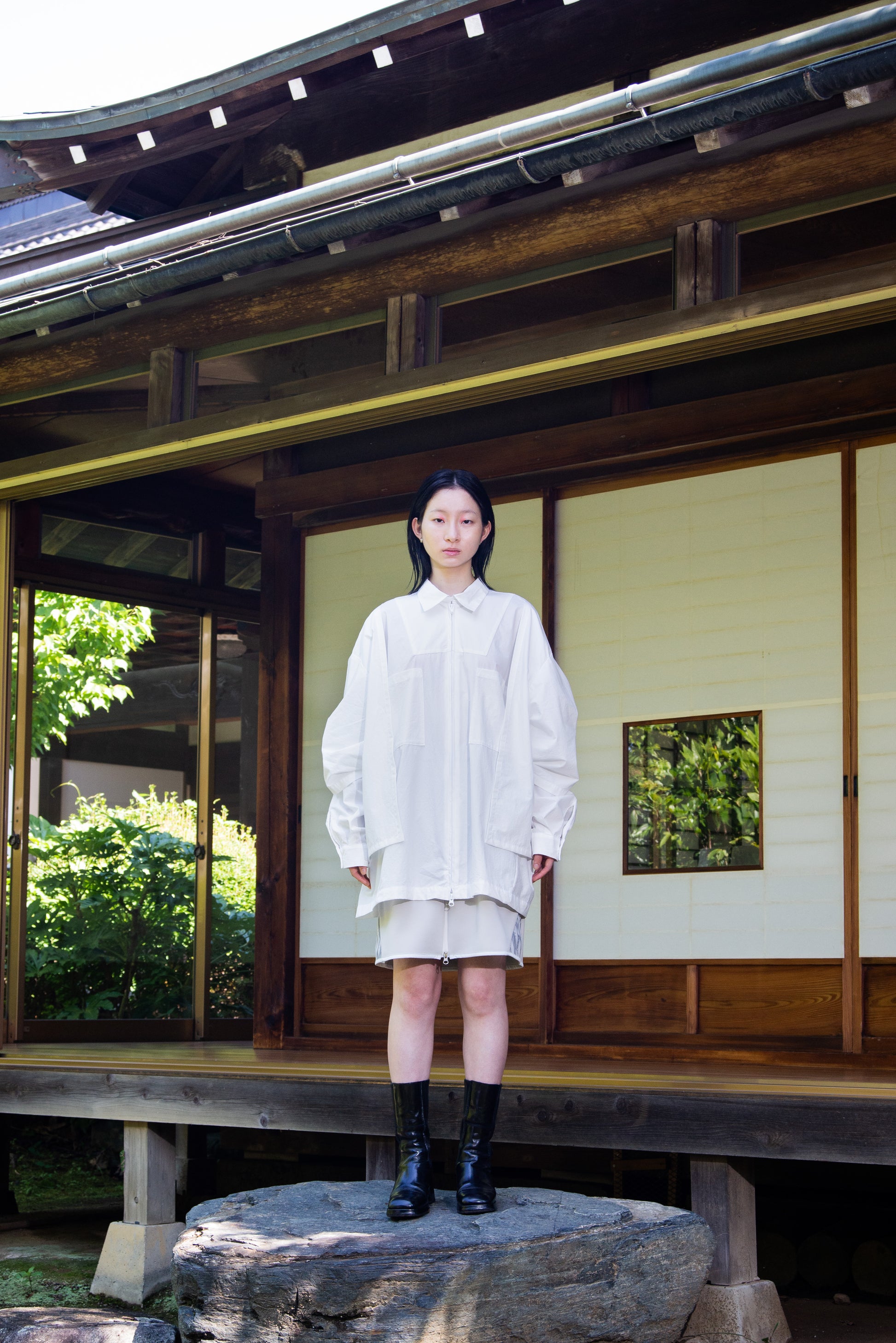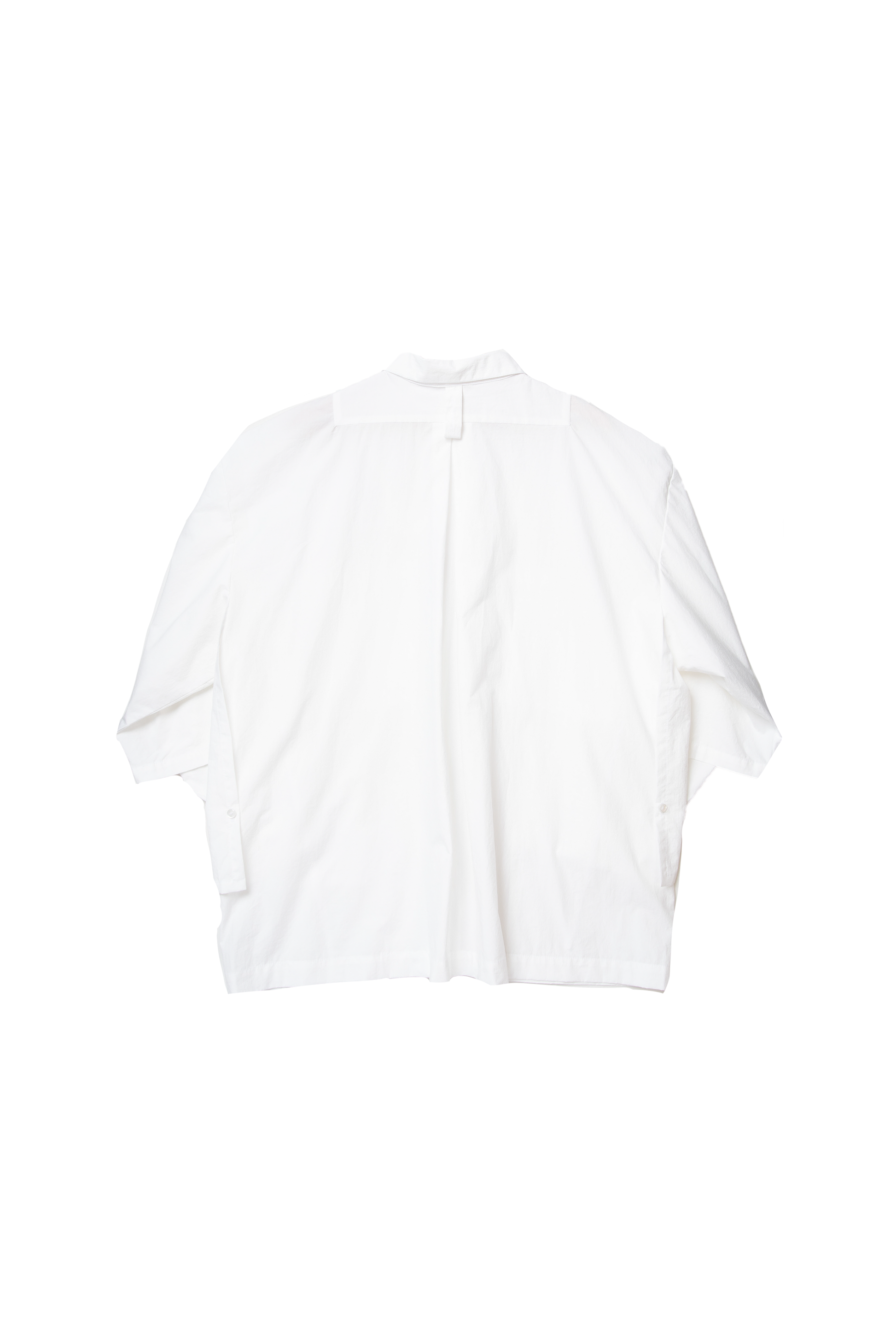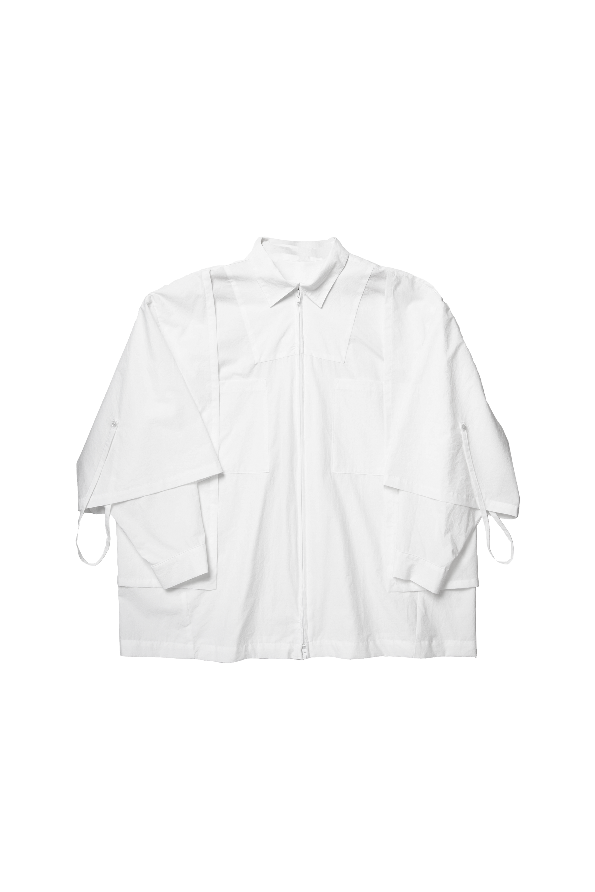 Dress shirt-like blouson which uses materials that have a vintage texture and natural grain. By using a zipper at the center of the front, it is comfortable to put on and take off, and by tying the two-sleeve cord at the back, there are many styling options available within a single garment. The width is roomy and can be worn comfortably by both men and women.